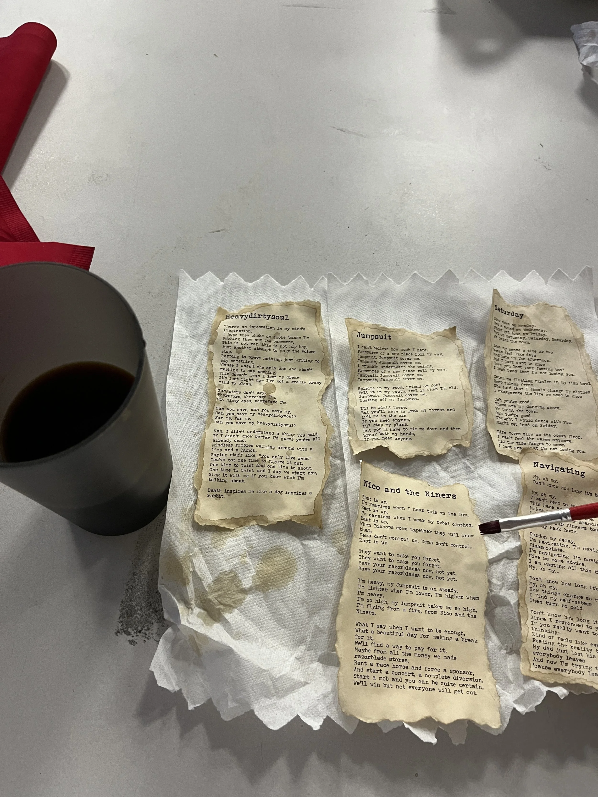 I first started this project by creating a moodboard and sketching ideas. I then collected various items and materials to physically create my album cover. I primarily used hot glue, black paint, broken ceramic, yellow flowers, and coffee-stained lyric sheets.